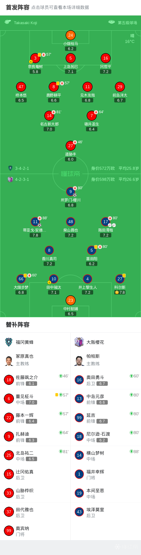 第44分钟,阪田澪哉倒三角,蒂亚戈-安德拉德破门,大阪樱花2-0福冈黄蜂