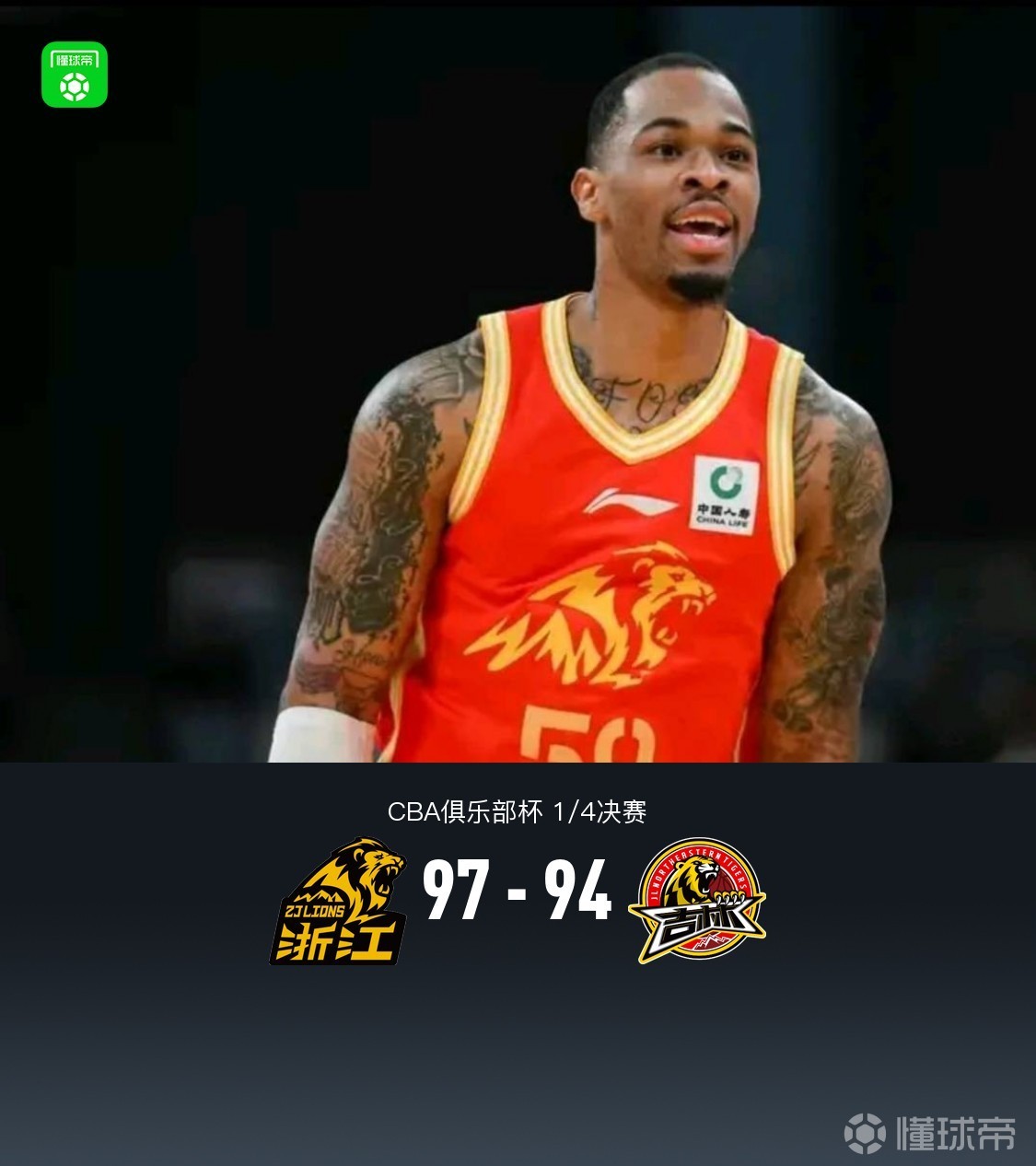 广厦97-94逆转吉林晋级杯赛四强,塔克48+6+11,栾利程18分