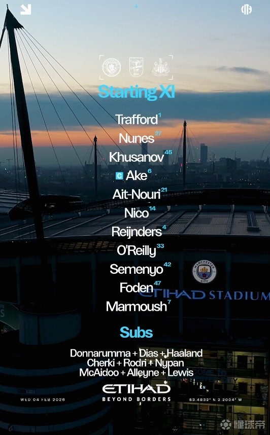 曼城首发:1-特拉福德、27-努内斯、45-胡桑诺夫、6-阿克、21-努里、14-尼科-冈萨雷斯、4-赖因德斯、33-奥赖利、42-塞门约、47-福登、7-马尔穆什